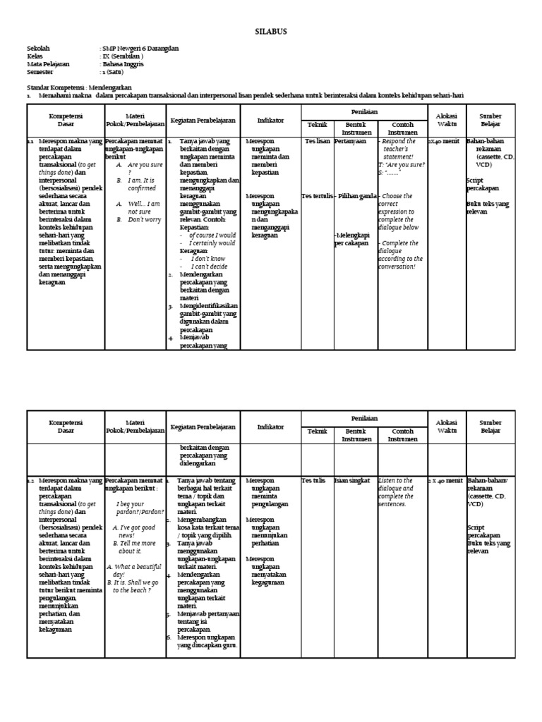 Berbicara mengenai perangkat pembelajaran, maka pada postingan kali ini saya akan kembali membantu bapak dan ibu guru yang sedang mencari perangkat pembelajaran gratis sebab pada artikel ini saya akan membagikan perangkat pembelajaran silabus untuk mata pelajaran bahasa inggris kelas 7 smp. Perangkat silabus bahasa inggris k13 kelas 7 semester 1&2 edisi revisi 2020 ini kiranya. Silabus merupakan dasar atau acuan dalam membuat. Silabus bahasa inggris kelas 7 semester 1 k13 revisi 2019.docx, unduh silabus bahasa inggris kelas 7 semester 2 k13 revisi 2018.docx, baca demikian silabus bahasa inggris kelas 7 jenjang smp/mts semester 1 kurikulum 2013 revisi 2019/2020 yang kami bagikan, semoga bermanfaat. Admin menyediakan soal dalam bentuk online dan pdf (offline) yang bisa di akses dan di download secara gratis di. Yang bisa digunakan untuk melengkapi administarsi guru yang dapat di unduh secara gratis dengan menekan tombol download. Silabus pembelajaran satuan pendidikan : Silabus k13 kelas 5 sd revisi 2018 (semua tema). Detail silabus bahasa inggris smp kelas 7 kurikulum 2013 revisi pdf dapat kamu nikmati dengan cara klik link download dibawah dengan mudah tanpa iklan yang mengganggu. Berikut ini admin bagikan silabus dan rpp. Beberapa contoh rpp berkarakter bahasa inggris dapat didownload di link di bawah ini. Soal uas bahasa inggris kelas 10 semester 2 2020. Silabus k13 bahasa inggris kelas 7 pdf.